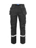 Workpant with open side pockets and back pockets with extra widht, left side with flap and magnetic closure. Holster pockets on both sides for tools, pens etc. Leg pockets, on left side pocket with flap and magnet closure, internal phone pocket and bracket for ID-card. On the right side pocket for folding rule and pocket for tools with knife button. Knee protection pockets, opening from the outside with zipper. Wider belt loop at the back to prevent pressure from belt. Hidden button at front. Pre-bent knees, stretch fabric in croatch and sewn-in stretch band in the waist for increased comfort. Reinforcement in the folding rule pocket, back pockets and over knees for increased durability. Tested for industrial washing according to ISO 15797 Increased visibility EN 17353 Supplied in a bio-based, compostable bag