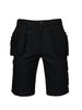 Shorts in durable cotton and reinforcements in Cordura¨. Holster pockets that can be tucked into side pockets on both sides, one with extra pockets and one with loops for tools. Leg pockets, on left side pocket with flap and press-stud closure, internal phone pocket and bracket for ID-card. On the right side pocket for folding rule and pocket for tools with knife button. Back pockets with extra width. Two adjustable hammer loops, one on each side. Two D-rings fastened at the waistband. Holster pockets are reinforced with Cordura¨ for increased durability.